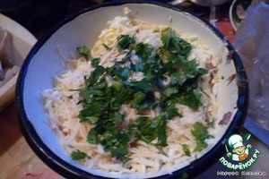 Селедку разделать (если не филе), нарезать маленькими кубиками