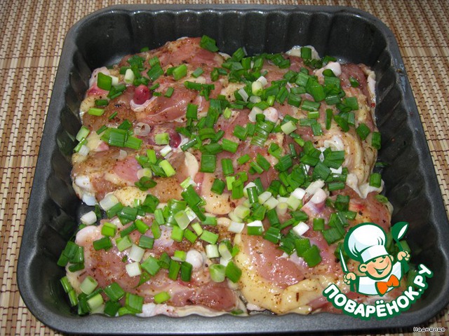 Лучок зеленый мелко режем и посыпаем окорочка.