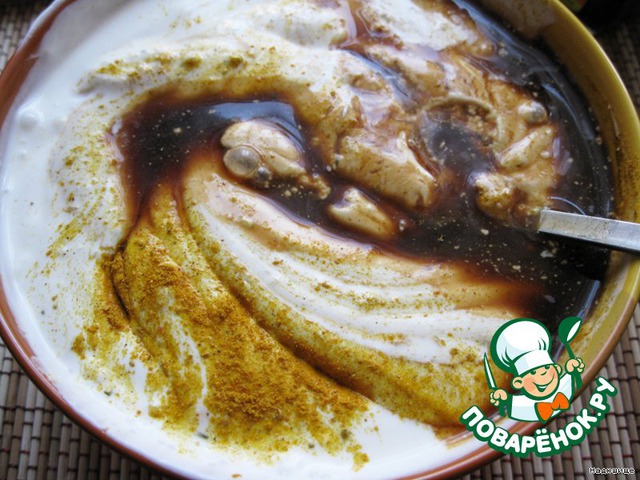 Готовим соус: сметану смешиваем с соевым соусом и карри.