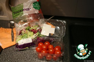 • Полпачки салатных листьев "Тоскана" и полкоробочки помидорок черри.