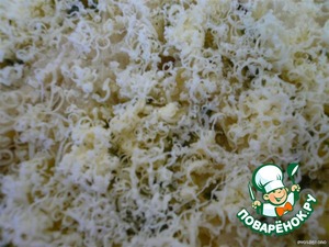Начинаем слоями укладывать различные сорта сыров. У меня оказалось 3 вида. Можно и одним обойтись. Но желательно много сыра, т. е. толстым слоем, ну, вы меня понимаете, сыра много не бывает.