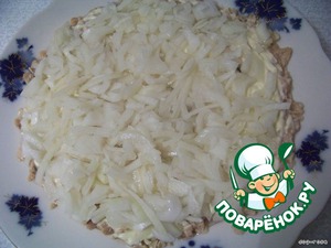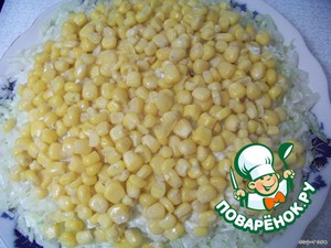 4 слой. Капусту рубим помельче, как следует перетираем с лимонным соком, солью, хорошо добавить туда еще молотый перец. Капустный слой в этом салате придает особую пикантность, с ним салат намного вкуснее. Майонез.