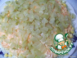И выкладываем салат слоями (любой слоеный салат должен постоять в холодильнике как минимум несколько часов, поэтому, если времени нет, лучше просто перемешать все компоненты). -