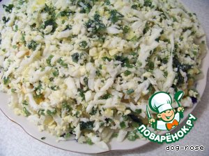 8 слой. Рубим ножом яйца (или на терке потереть), смешиваем их с нарезанной зеленью, посыпаем салат. Вообще-то в рецепте этого салата, который я когда-то прочитала в журнале, нужно было для последнего слоя взять четыре желтка + зелень. Может, так будет и красивее, но куда девать белки, я не знаю, поэтому всегда делаю с яйцами целиком. Но на всякий случай пишу, что можно и так.