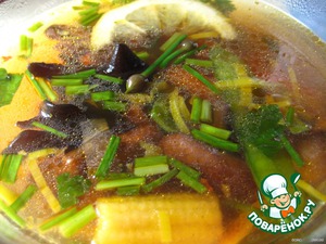 Добавить горячий бульон, древесные грибы и варить 10-15 мин., добавить лук-порей, нарезанный крупными кольцами и варить