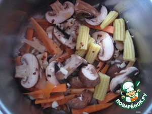 В кастрюльке на ростительном масле обжарить чеснок, морковь, шампиньоны, кукурузные початки, острый перец - 5-10 мин.