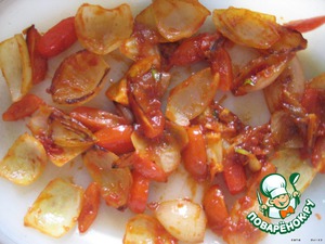 Добавляем мякоть лимона и часть (для соуса) нарезанных помидоров, соль, перец и тушим около 5 мин, выкладываем в огнеупорное блюдо.