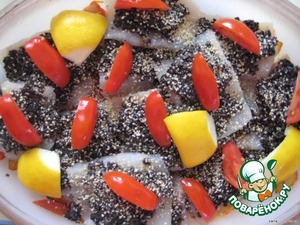Кусочки рыбы выкладываем сверху, намазываем тапенадом, посыпаем сухарями, украшаем остатками помидор и лимонными корочками и ставим в разогретую (220°C) духовку на 15-20 мин.