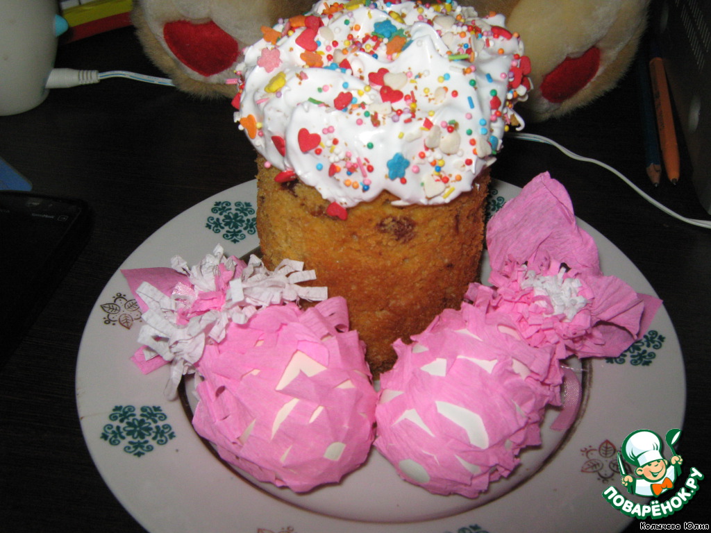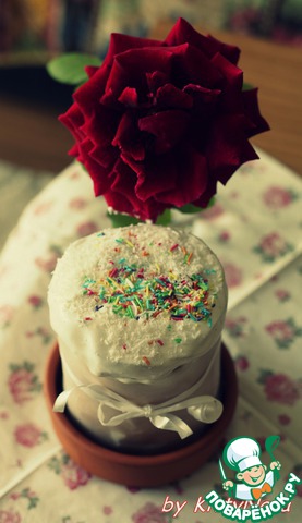 Рецепт по телефону продиктовала подруга. Я решила попробовать его, исключительно, из спортивного интереса - этот кулич не требует длительного замеса и обминок. Куличики получились отличными!