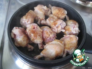 Куриные голени посолим поперчим, обжариваем до полуготовности, выложим в кастрюльку.