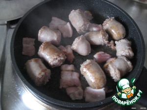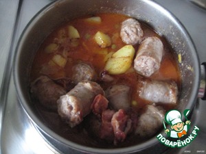 Колбаски (кусочками длиной в 5-7 см.)и грудинку (мелкими кусочками) обжариваем, выложим в кастрюльку.