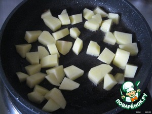 Картофель (кубиками) обжариваем до полуготовности, выложим в кастрюльку к калбаскам.