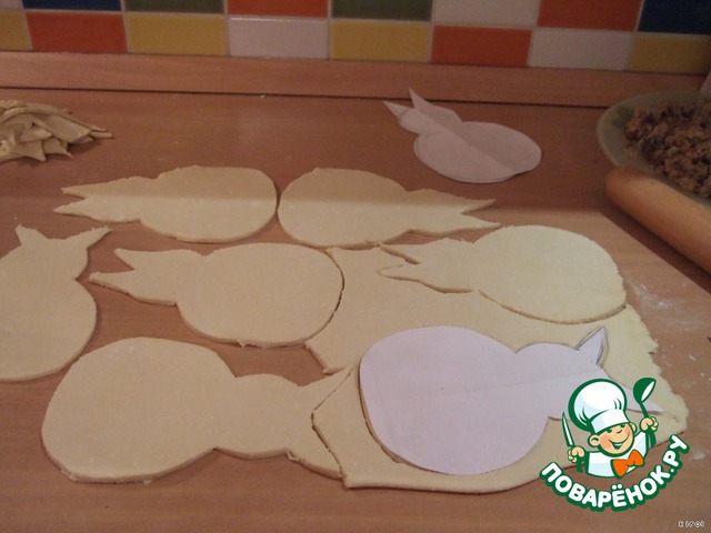 Кладем начинку, края смазываем белком, накладываем верх и чуть-чуть придавим (чтоб схватилось).