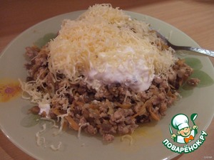 Начинку остудить, добавить сметану и сыр. Хорошо перемешать