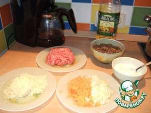 В это время готовим начинку: разогреть масло, лук обжарить, добавить морковь, затем рубленое мясо и как следует пожарить (не пересушивайте). Добавить чечевицу + 3 ст. л. воды и потушить ещё минут 5.