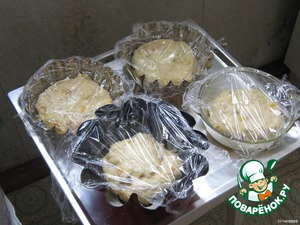 В подошедшее тесто вмешать сухофрукты и выложить в формы на 1/2 высоты. Прикрыть пленкой и оставить подходить