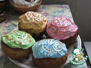 Украшаем остывшие куличи глазурью. Я просто взбила белки с сахаром и добавила пищевых красителей.