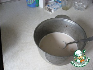 Делаем опару: 1,3 стакана молока нагреваем и растворяем в них дрожжи и 2 ч. л. сахара, подмешать 2/3 стакана муки (я забыла!, но у меня все равно дрожжи поднялись)
