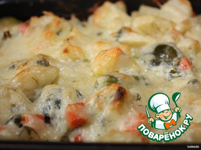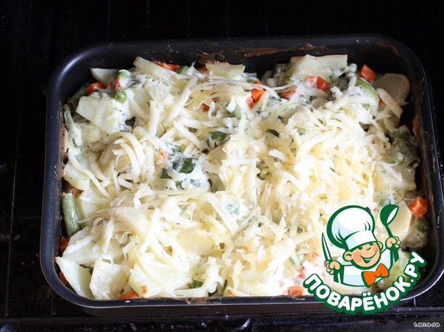 Через 30 минут пребывания в духовке посыпаем овощи тертым сыром и еще минут на 5-7 оставляем готовиться.