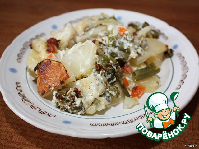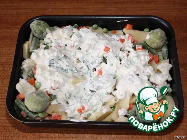 Перемешиваем зелень со сметаной и выливаем на наши овощи. Перемешиваем и ставим в духовку на средний огонь -