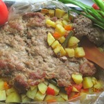 Сдобренные овощи осторожно помещаем в рукав и добавляем фарш, распределяя его по всей овощной поверхности.