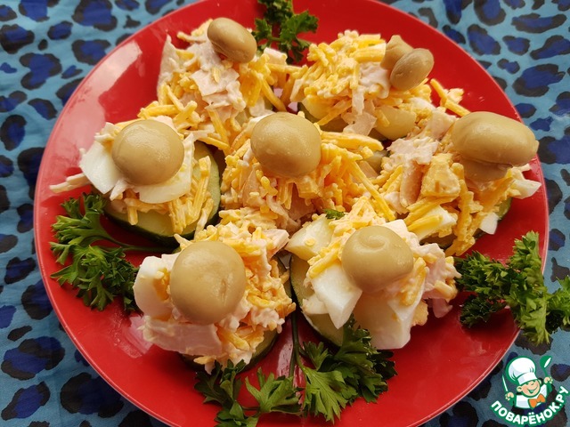 Cкатываем из получившейся смеси шарик (лучше мокрыми руками), втыкаем в серединку грибок и кладeм на огурчик. Очень вкусно и очень свежо.