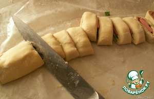 Свернуть тесто рулетом, нарезать острым ножом на кусочки по 1,5-2 см.