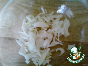Пока грибочки кипят в воде возьми луковицу и настругай полукольцами.Отправь лук в подготовленный салатник.