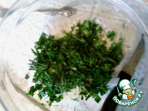 К луку присоединяется мелко нарезанная зелень петрушки и укропа.