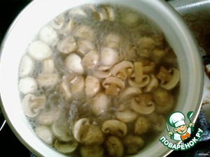 Промытые и очищенные шампиньоны отвари в кипящей воде 5-10 минут. Если очень маленькие - можно целиком.Крупные - разрежь так, как тебе больше нравиться.