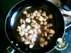 К этому времени грибочки уже готовы. Откинь на дуршлаг - пусть стечёт вода.На сковородку-оливковое масло и сваренные грибы. Жарь их до румяной корочки (минут 5-10)