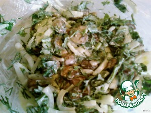 Жаренные шампиньоны отправляются в салатник к луку и зелени.