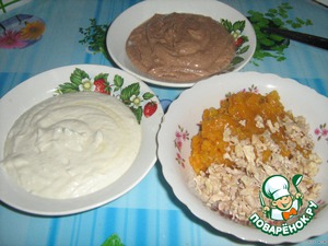 Творог протираем ,добавляем:сахар,кокос,желатин,растопленый белый шоколад в половину смеси добавить какао .