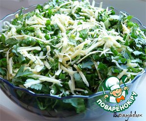 Нарезать мелко всю зелень, натереть через крупную тёрку сыр, посолить чуть-чуть (так как сыр солёный и лаваш тоже), поперчить.