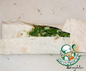 Положить начинку на лаваш и свернуть конвертиком.