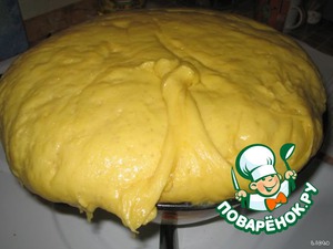 3/4 готового теста раскатать в круглый пласт и выложить в смазанную маслом форму для запекания.