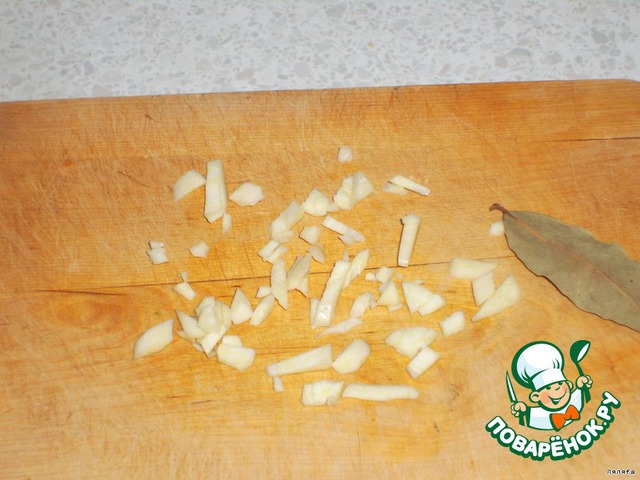 Нарезаете чеснок, готовите лавровый лист и кладете тоже к куриному сбою