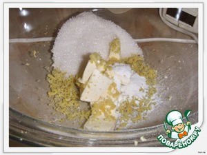 Масло растереть с цедрой, ванильным сахаром и 75 г сахара.