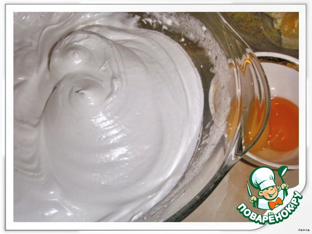 2 белка отделить от желтков и взбить, всыпав струйкой 75 г сахара. -
