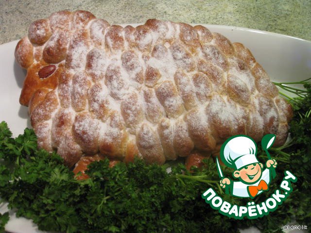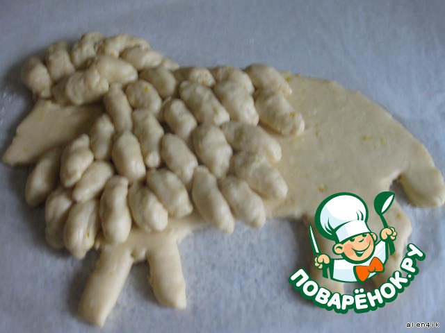 Из отставшегося теста сформировать жгуты размером 3,5 см в длину на 0,5 см в диаметре, скрутить и выложить, как локоны, на ягненка (кроме ног и мордочки)
