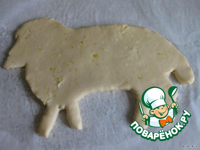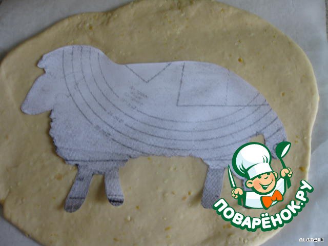 На пласт теста положить вырезанный из бумаги шаблон ягненка (размером примерно 20х25 см).