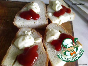 На ломтик хлеба кладём майонез и кетчуп.