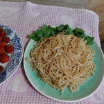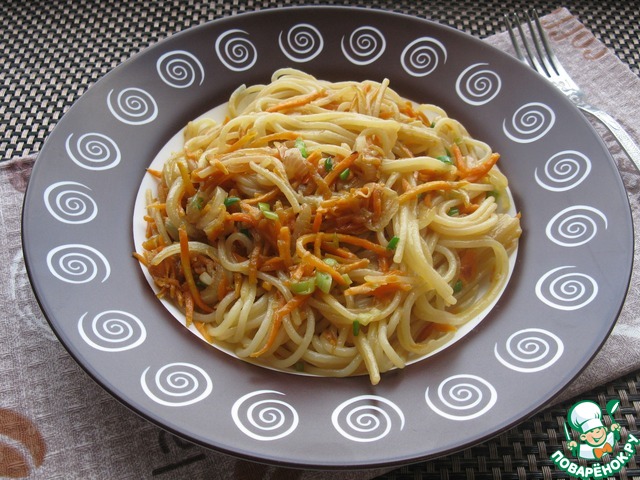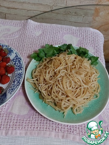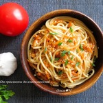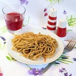 Когда соус будет готов, положить в него горячие спагетти, подержать на огне 5 -10 минут, хорошо помешивая. Все.