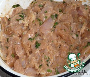 Порезать курицу кубиками (2,5 см.) и выложить в глубокую чашку. В отдельной чашке смешать все наши специи и добавить к курице. Полить курицу простоквашей и хорошенько перемешать. Накрыть и оставить на 2 часа, а лучше в холодильник, на ночь (я оставляла на ночь).