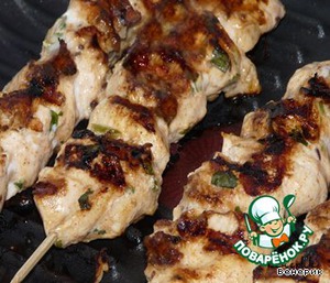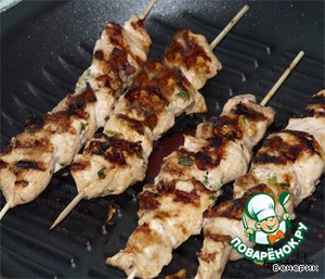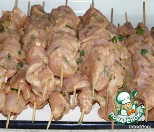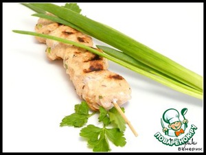 Нанижите кусочки курицы на деревянные шпажки (предварительно замоченные).