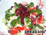 Крупно режем огурцы, перец, лук кольцами, если лук маленький, или полукольцами, если большой. Режем курицу квадратами и добавляем фасоль.