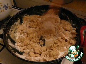 Примерно так выглядит готовая мука, затем высыпаем в нее две части сахара, т. е. получается соотношение масло 1 часть:мука 3части:сахар 2части. И продолжаем мешать не останавливаясь.