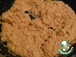 Оставшееся масло перелить в какую-либо емкость, чтобы видеть, сколько его поучилось. Далее засыпаем муку в соотношении 1:3, т. е. муки в три раза больше, чем масла. И жарим ее на большом огне постоянно помешивая деревянной ложкой (это очень важно!!!) пока она не станет коричневого цвета. Мешается сложновато (предупреждаю сразу!).