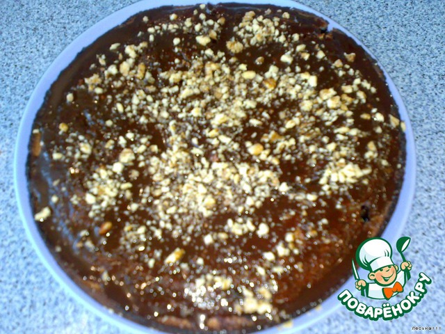 Поливаем глазурью наш пирог. Посыпаем измельченными орехами. Приятного аппетита!