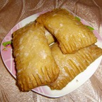Обычно я его пеку в виде пирога: тесто делю на две части, раскатываю, одну часть укладываю на небольшой смазанный противень, смазываю повидлом, накрываю вторым пластом, придавливаю по-бокам пальцами и вилкой. Печь так же 10 -15 минут и покрыть глазурью (так быстрее